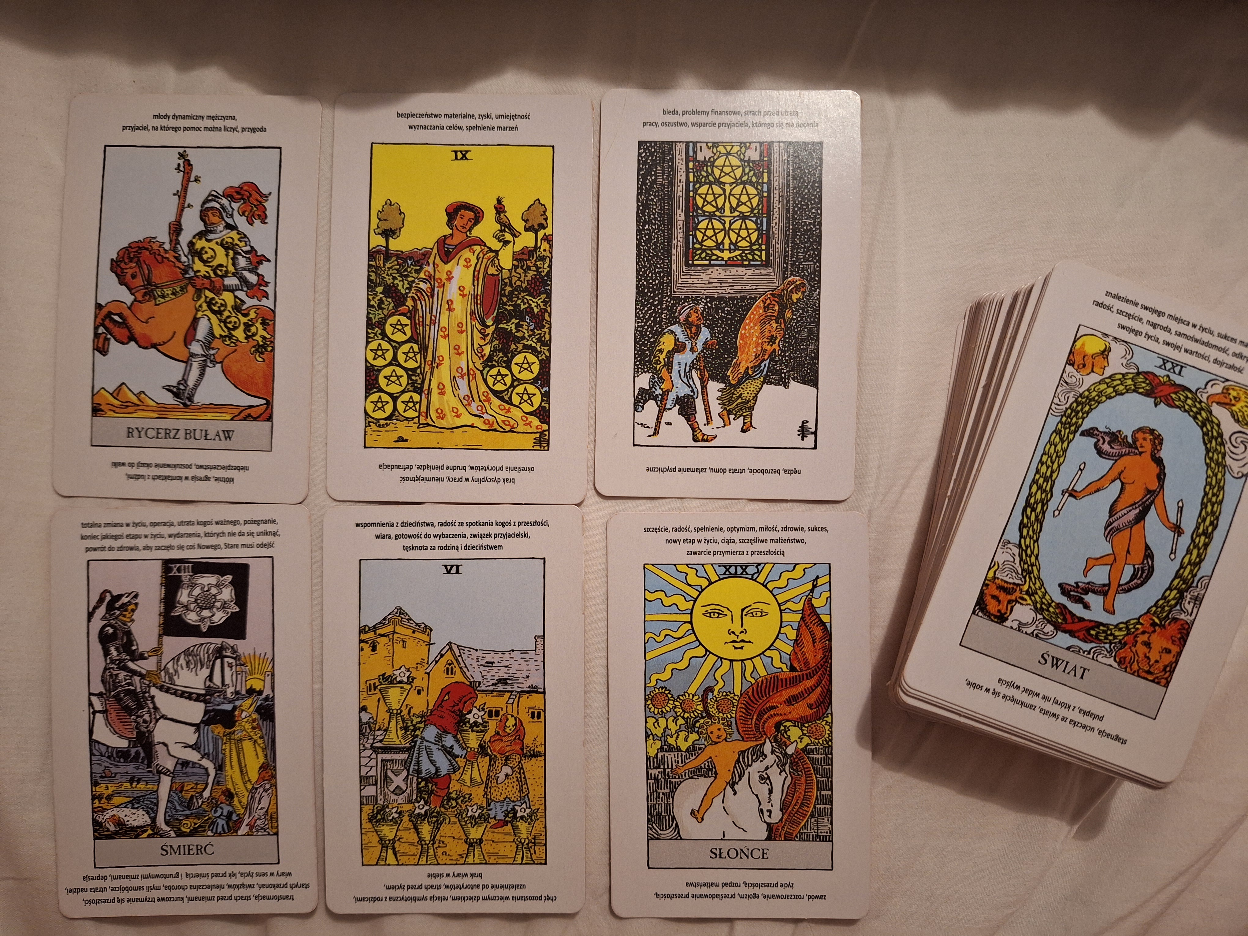 SowAna Napisano Luty 24, 2024 Napisano Luty 24, 2024 ok, jeżeli nie stawiałaś kart rozkładem, gdzie każda karta ma swoją pozycję i był to liniowy wariant (nieokreślający czasu, co wg mnie nie pomaga)to poniższe może opowiadać sporo różnych sytuacji, m.in. taką: Rb, 9d, 5d, XIII, 6k, XiX - są duże chęci na spotkanie kogoś, Rb może być tym nowo spotkanym kimś, 9d na karcie jest sama, jej to wystarcza, jest jej dobrze, w 5d jest rada, aby nie przeinwestować, bo w XIII można popełnić nieodwracalny błąd, powracające uczucia w 6k i może radość z czegoś nowego w XIX. 1 Cytuj