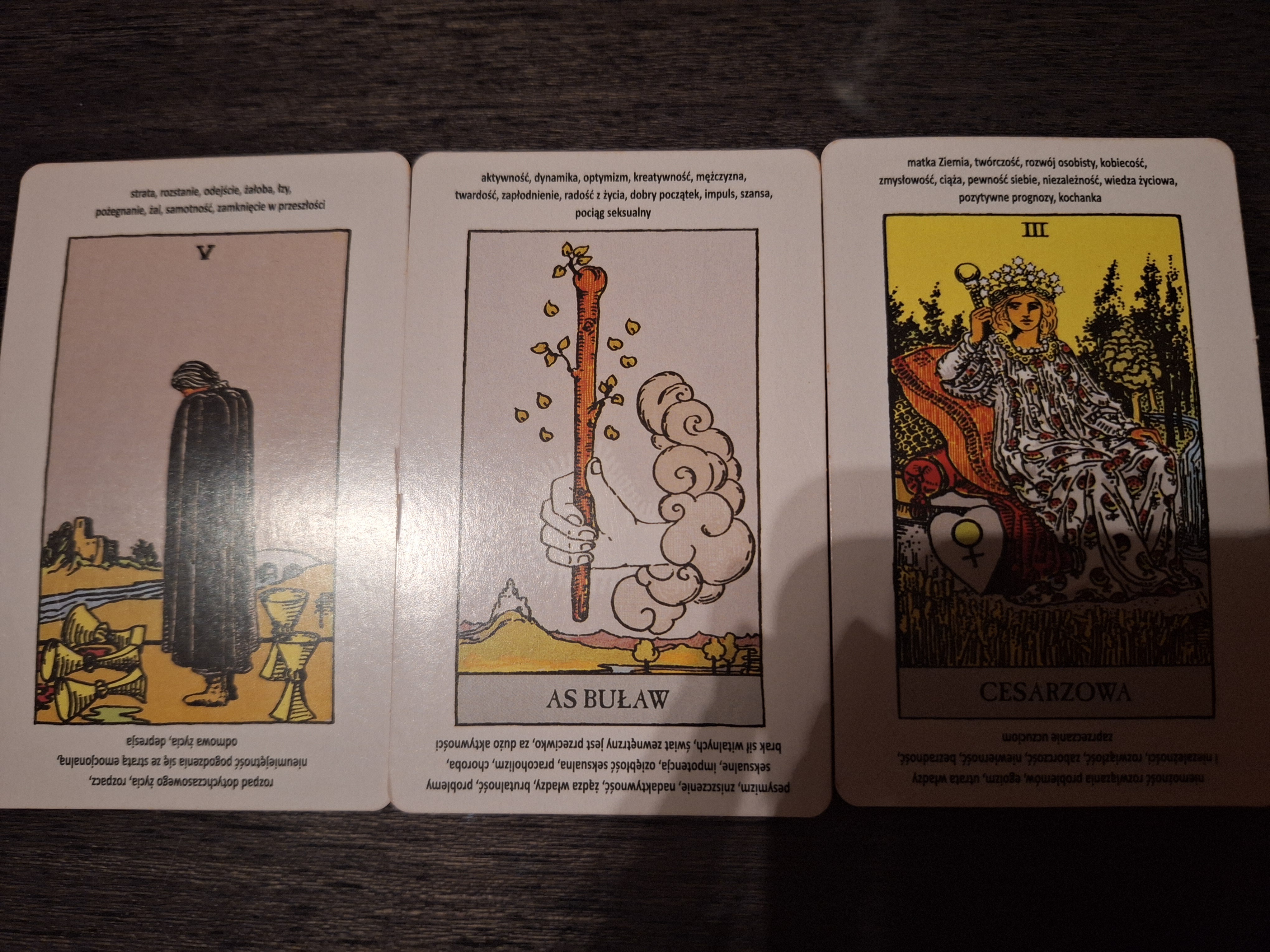 Trish Napisano Marzec 5, 2024 Napisano Marzec 5, 2024 Ten, który mnie zranił wrzucił na fb romantyczne foto z romantyczna wielce piosenka w tle. Zadałam kartom pytanie, pod kogo ta atencją. I wyszły mi takie karty. Rozpamiętuje lub chce poruszyć te, która pożąda i która jawiła mu się ideałem. Ha, dalej więcej nie wiem. Ale jeśli Rozpamiętuje, to raczej te, która zniknęła, niż te, z którą miał przygodę? Pomóżcie. Nie chcę już dziada, ale chociaż kart się naucze:) Cytuj