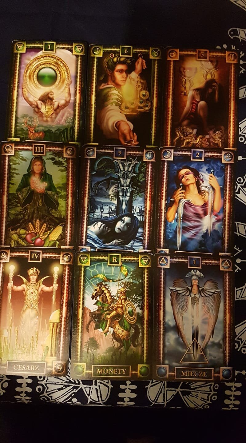 Szamanka Napisano Kwiecień 1, 2020 Napisano Kwiecień 1, 2020 Wiem,że tak się nie robi.Jednak proszę o pomoc w interpretacji tego rozkładu.Poprosiłam jedną wróżkę o wylosowanie kart rad na pewną znajomość.Chciałabym poznać zdanie też zdanie kogoś innego na ten temat. Pierwszy rząd poziomy:As denarów,6 denarów,5 kielichów Drugi rząd poziomy:Cesarzowa,9 mieczy,2 mieczy Trzeci rząd poziomy:Cesarz,Rycerz denarów,As mieczy. Mam też zdjęcie kart,ale nie mogę go wrzucić publicznie,bo wiadomo. Cytuj