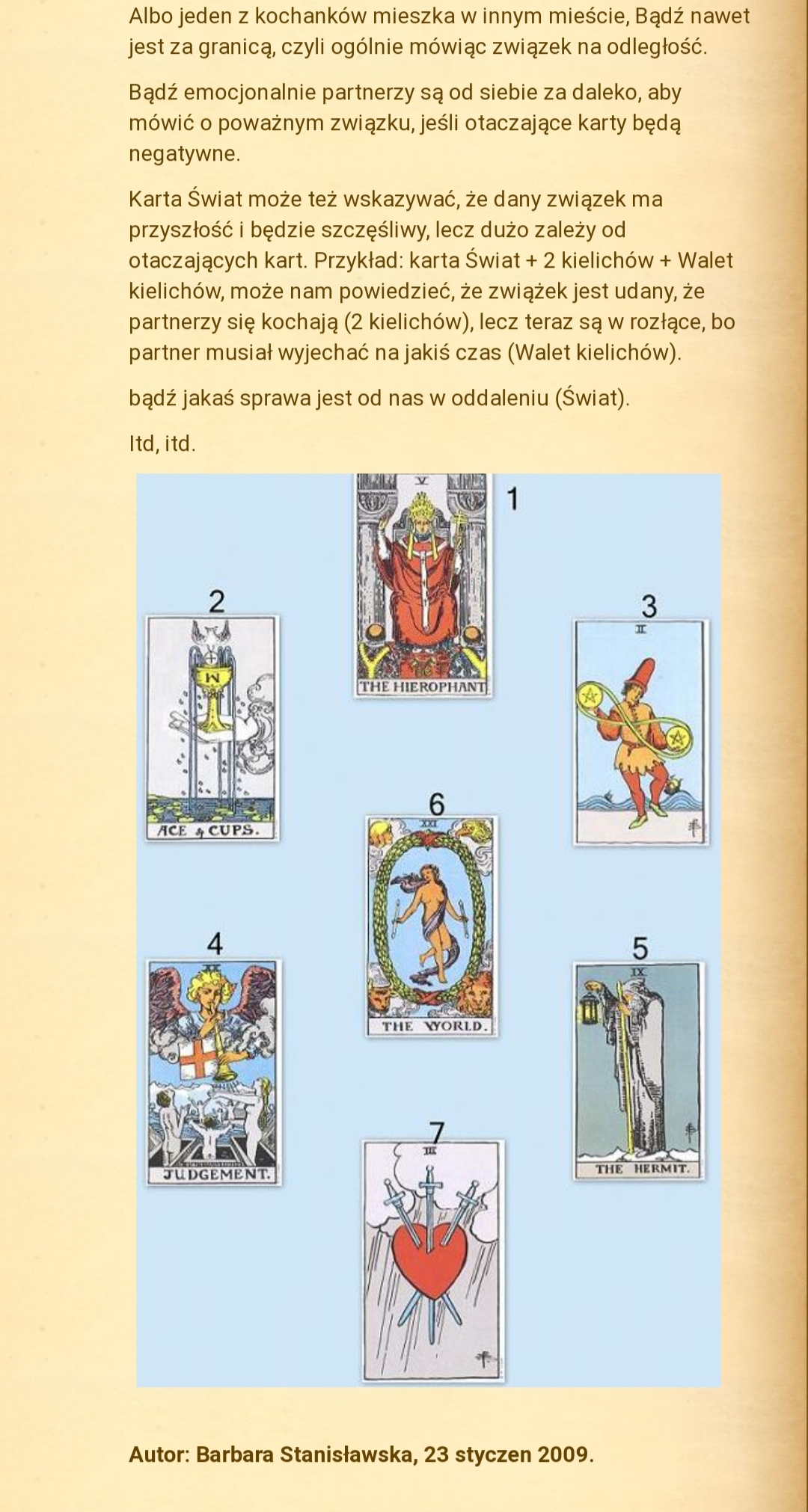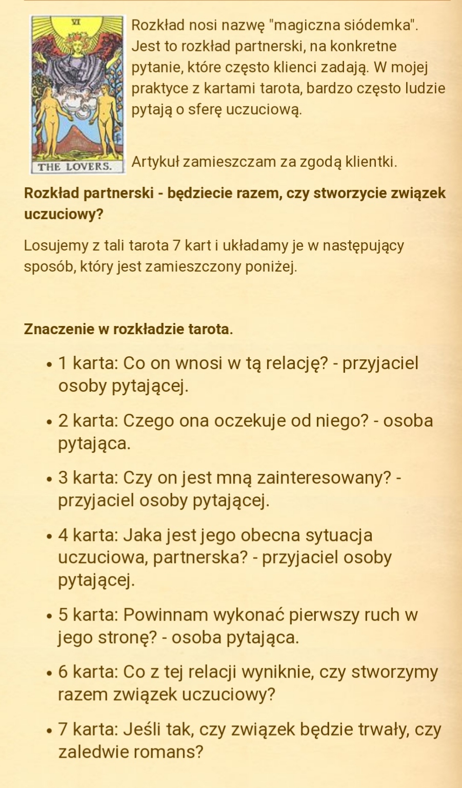 Egeria Napisano Listopad 22, 2020 Napisano Listopad 22, 2020 @bluesecret07 W tym rozkładzie o znajomości na odległość jest faktycznie mowa i wskazuje na nią oczywiście karta Rydwanu. Jednak pozostałe karty dają nadzieję na stworzenie miłego, pełnego pasji i miłości związku o ile nie popadniesz w przesadzę i zachowasz zdrowy rozsądek. Pamiętaj, że to tylko karty, a Ty się dopiero uczysz. Podaje interpretację kart po kolei, żebyś wiedziała na co zwrócić uwagę. 1. Diabeł - (niewyraźna fotka, ale chyba to on ) dużo erotyzmu, dużo seksu, ale bez miłości, karta Cesarza leżąca niemal bezpośrednio pod Diabłem może wskazywać na pewną dozę niezdrowego uzależnienia od tego mężczyzny lub formę wykorzystywania seksualnego. 2. Sąd - ta karta pokazuje wprost, że nie miałabyś nic przeciwko legalizacji związku (ślub) lub przynajmniej oficjalnego "chodzenia". 3. Cesarz - typowy facet, trochę macho, więc tak - może być Tobą bardzo zainteresowany (i tutaj trzeba mieć na uwadze wspomnianego wyżej Diabła). 4. Rydwan - ta karta nie wskazuje aby kogoś miał, raczej jest na etapie poszukiwań. 5. Arcykapłanka (odwrócona) - możesz wykonać ruch w jego stronę, ale zachowaj dużą dozę ostrożności i nie wierz we wszystko co powie. Nie bądź łatwowierna. 6. Zakochani (Kochankowie) - jest szansa na stworzenie dobrego związku, w którym będziecie dzielić wspólne cele, może być nawet formalizacja związku. 7. Świat - tak, związek powinien być trwały, oparty na miłości i szczęściu. Tak to mniej więcej wygląda. Osobiście nie stosuję książkowych rozkładów, ponieważ jak dla mnie, zostawiają za mało miejsca dla intuicji. Moim zdaniem one są dobre tylko do nauki. Najpierw jednak radziłabym Ci wyuczyć się chociaż po kilka znaczeń kart zanim zaczniesz je rozkładać i to już w tak zaawansowanej formie. Powodzenia w nauce 1 Cytuj W miarę możliwości na pytania odpowiadam w ciągu 48 godzin. Dziękuję za wyrozumiałość